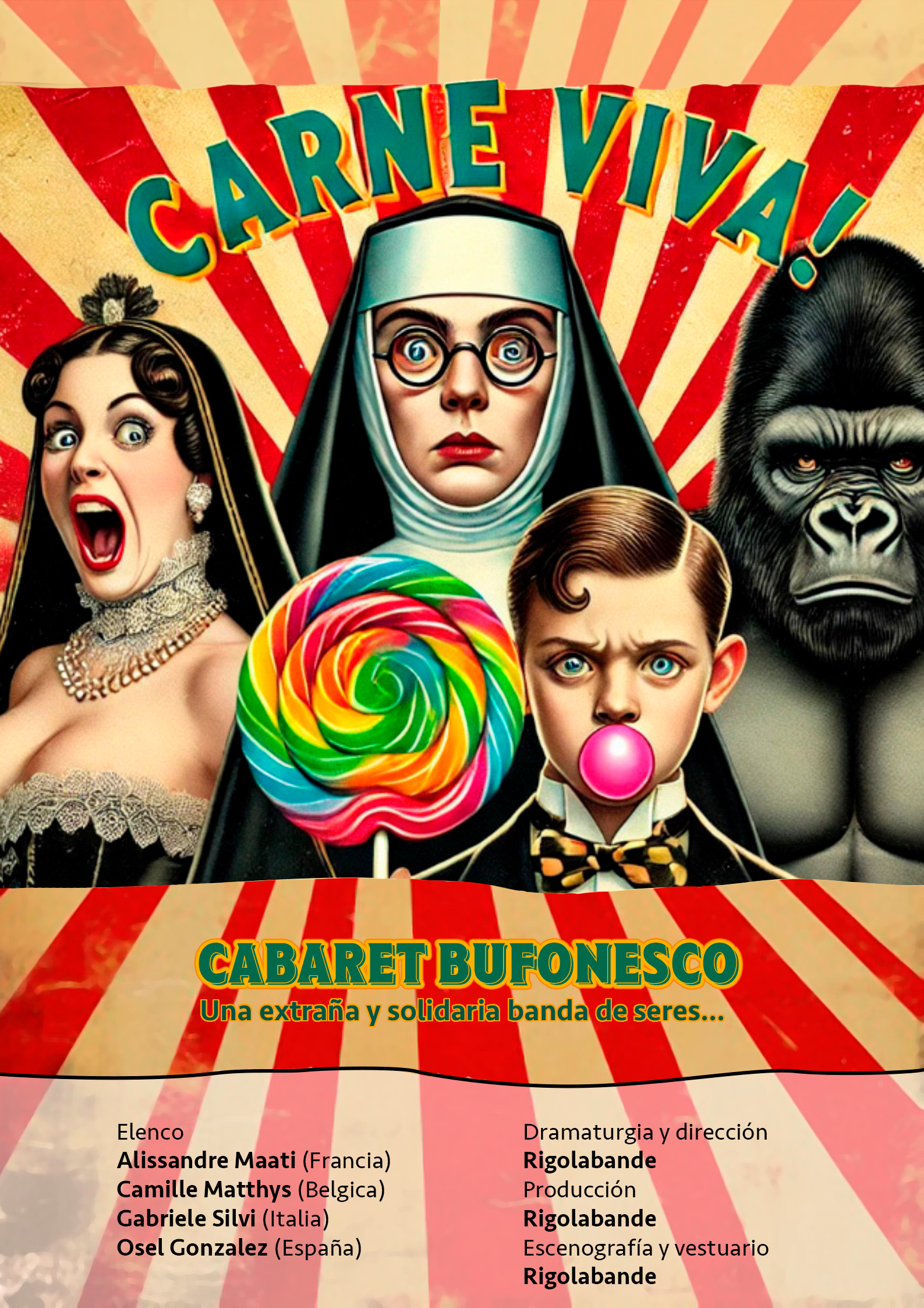 Abriendo el Festival, la compañía belga Rigolabande presenta Carne Viva! Cabaret Bufonesco. Una extraña y solidaria banda de Bufones, llegados de vaya usted a saber dónde, que se disponen a mostrar un espejo deformado de la sociedad. Un espectáculo que transformará Nave 73 en un Cabaret el viernes 28 de marzo a las 20:30h.